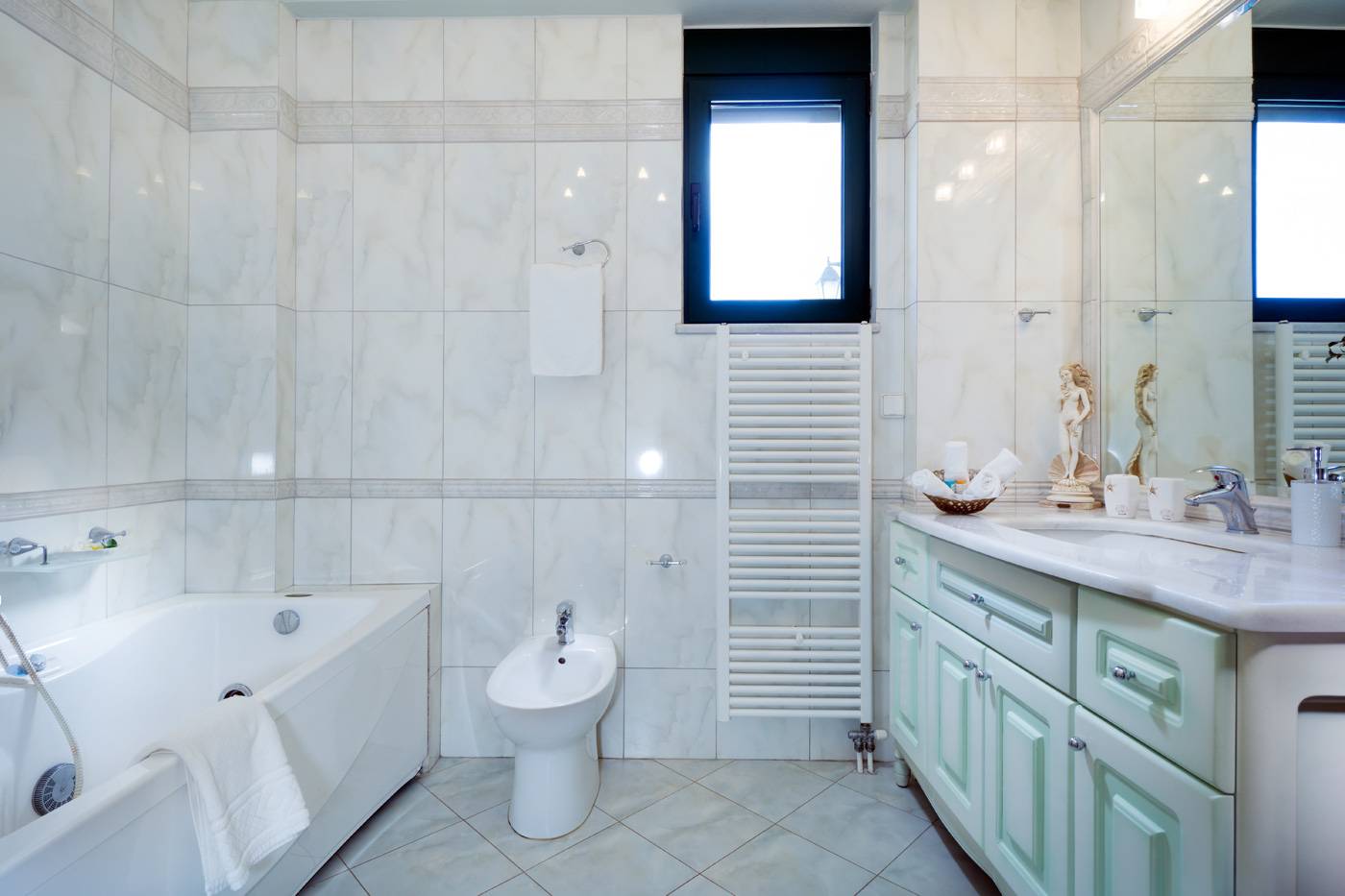 An elegant open plan living room with a fireplace, a dining area and a fully equipped kitchen with a big refrigerator, oven, microwave, toaster and coffee maker are provided on the pool floor. Two bedrooms with double bed and a common bathroom with bathtub can be found on this floor as well.