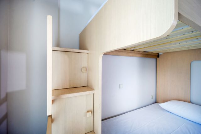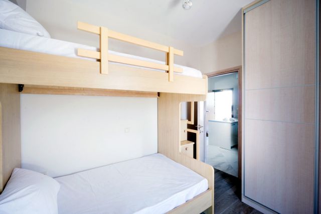 An open plan area with a living room corner with TV, a fully equipped kitchen, and a dining table are provided on the pool floor. One bedroom with two bunk-beds and a common bathroom with washing machine are also available on this floor.