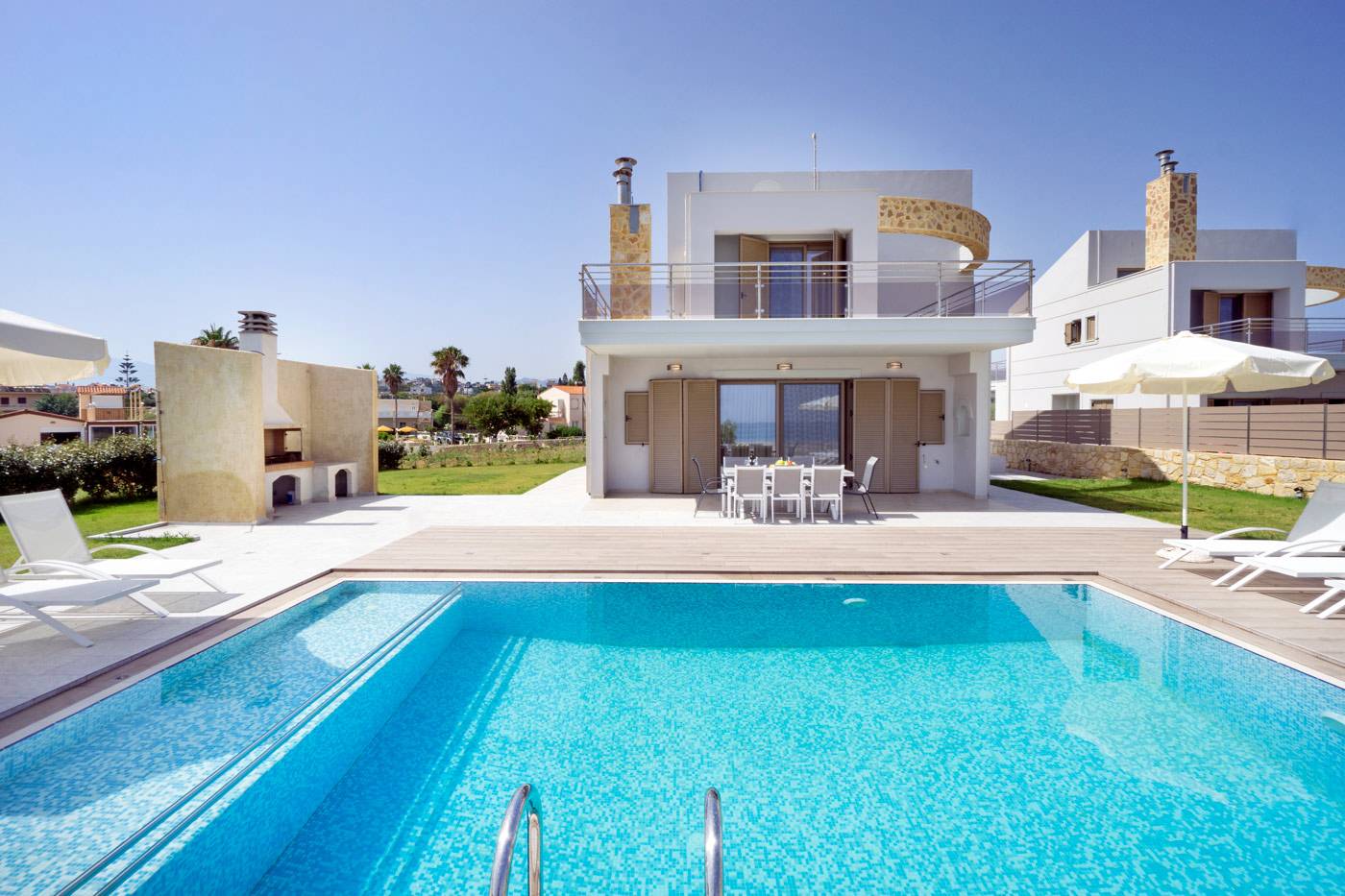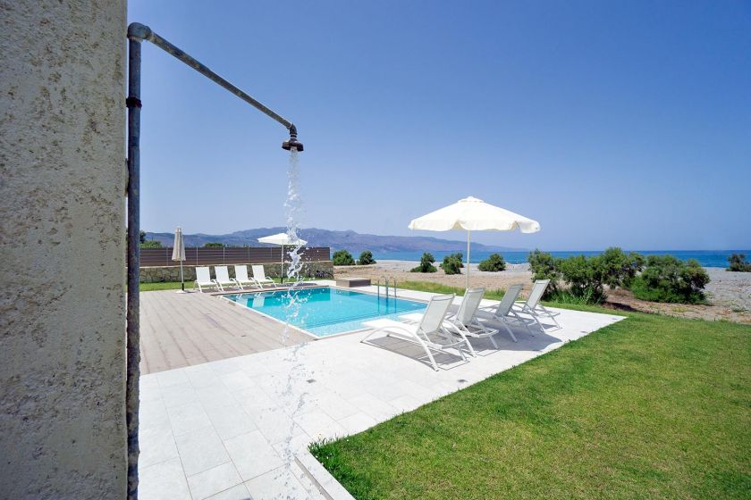 Beach Villas are two seafront, modern 4-bedroom villas each with a private pool and lovely sea views, in front of the mixed sandy and shingle beach of Tavronitis, 25 km west of the picturesque town of Chania. Every Villa has a lovely courtyard with a sea view pool and a barbecue corner.