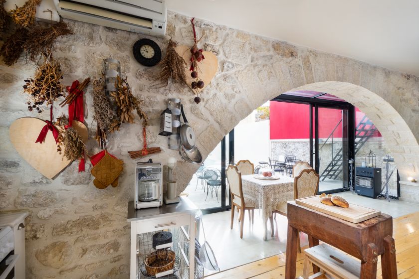 Upon entering from the street level, guests are welcomed by two charming bedrooms on the ground floor. Ascend the wooden staircase to the upper level, revealing a spacious and charming open-plan area that extends to the private pool and the beautiful courtyard.