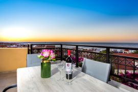 Ein offener Wohnbereich mit Meerblick, einer Wohnzimmerecke, einem Esstisch und einer voll ausgestatteten Küche werden angeboten.