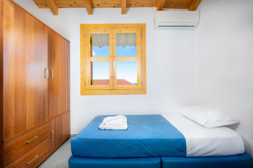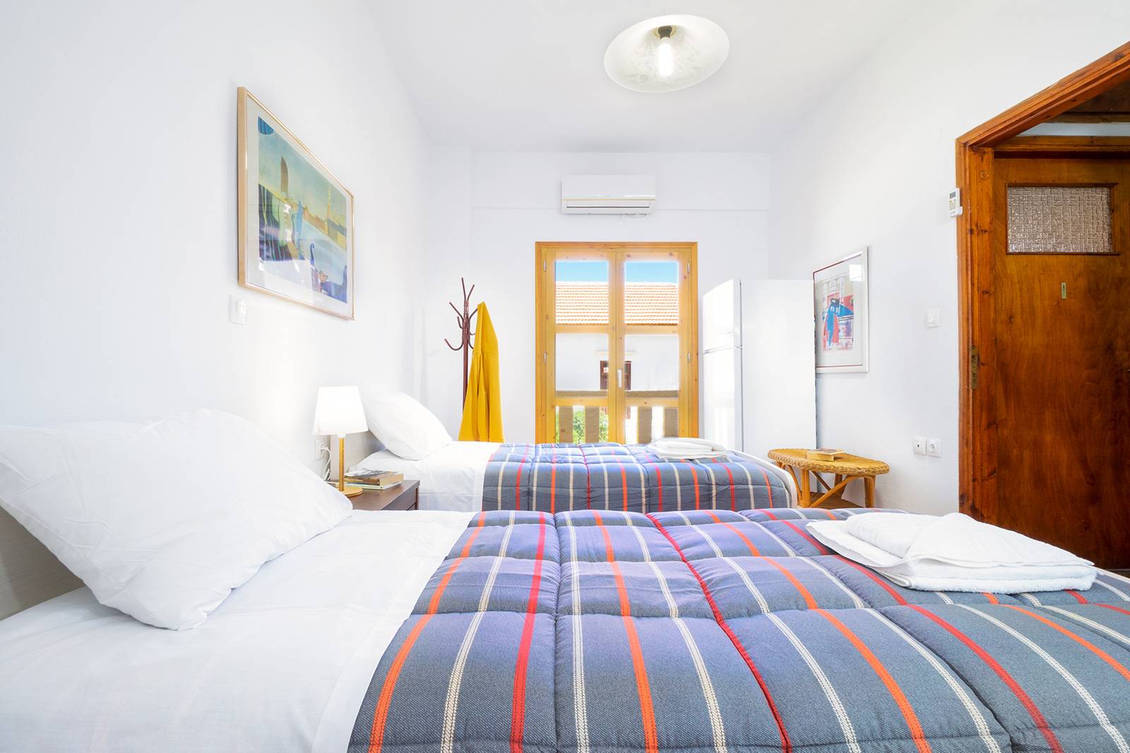Eleni House has a beautiful open plan area with a fully-equipped kitchen and a living room corner with a smart TV on the ground floor. Two bedrooms with two single beds each and a bathroom with a bathtub and a washing machine are provided on the middle floor.