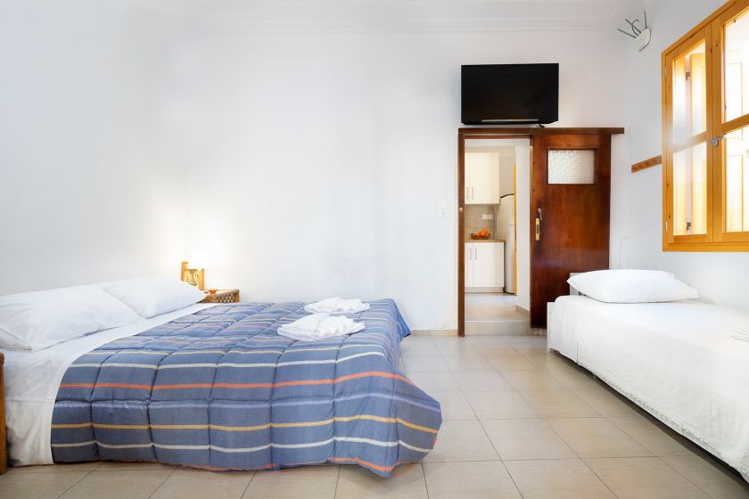 The 2-bedroom Clio Apartment offers an open plan bedroom with a double bed, a smart TV, a sofa and a balcony as well as a second bedroom with two single beds. A kitchen area with a kitchenette, a small refrigerator, a microwave, coffee machine and a dining table in addition to a shower bathroom are provided.