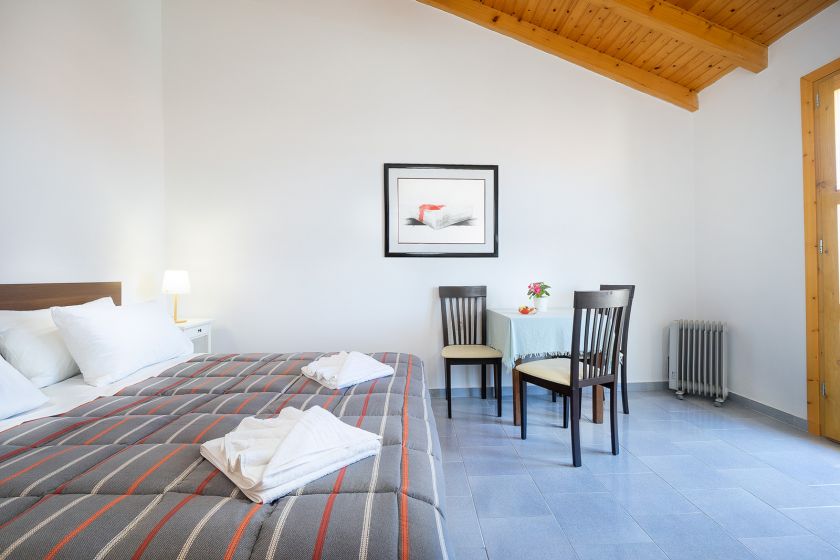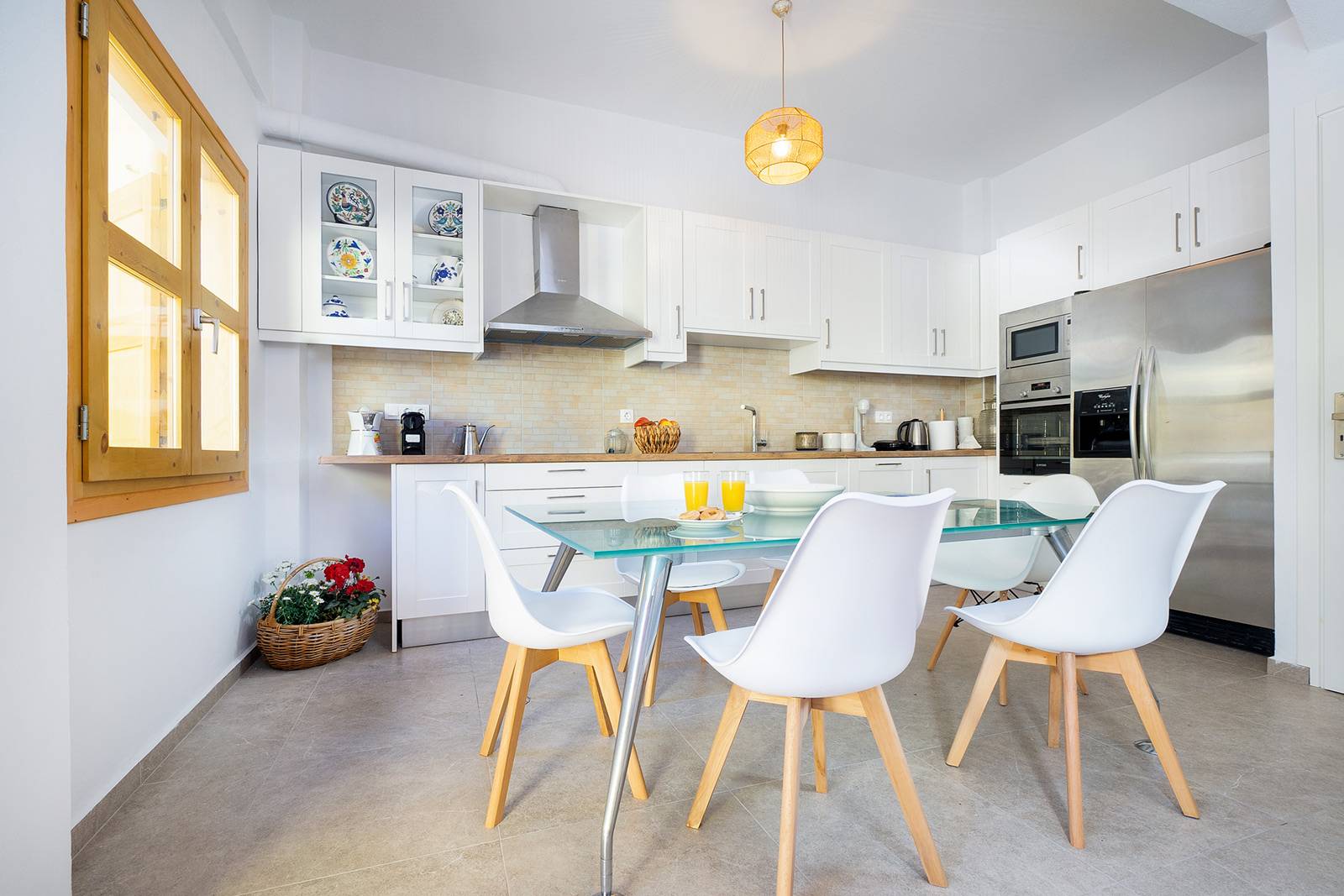 The 4-bedroom Eleni House has a beautiful open plan area with a fully-equipped kitchen and a living room corner with a smart TV on the ground floor. Two bedrooms with two single beds each and a bathroom with a bathtub and a washing machine are provided on the middle floor.