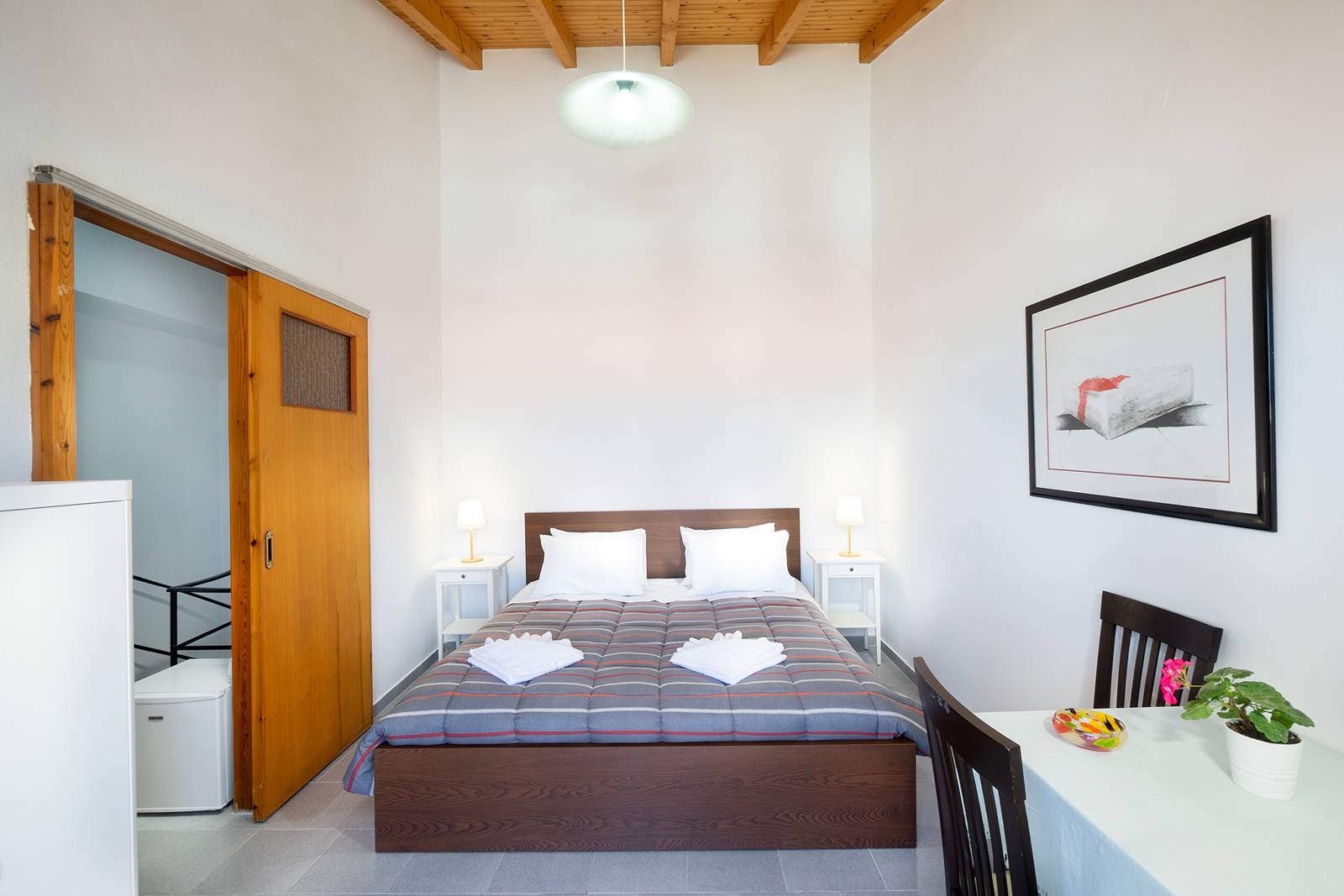 Mina Apartment has an open plan living room area with a corner sofa bed, a TV and a dining table. A fully equipped kitchen with stove, oven, refrigerator and coffee maker is offered. One bedroom with a double bed and a shower bathroom are provided.