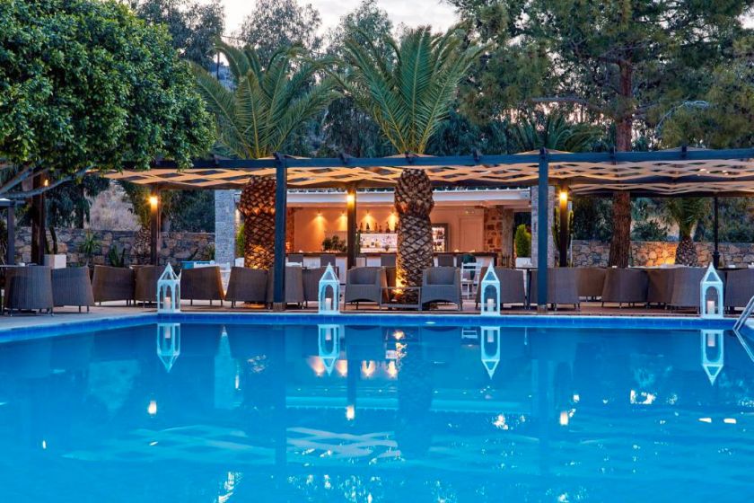 Elounda Palm Hotel & Suites is a family-run hotel set near the sea in beautiful Elounda, offering a relaxed stay with Mediterranean charm and modern comforts. Guests can unwind by the large outdoor swimming pool, enjoy drinks at the poolside bar, or relax in the lounge areas.