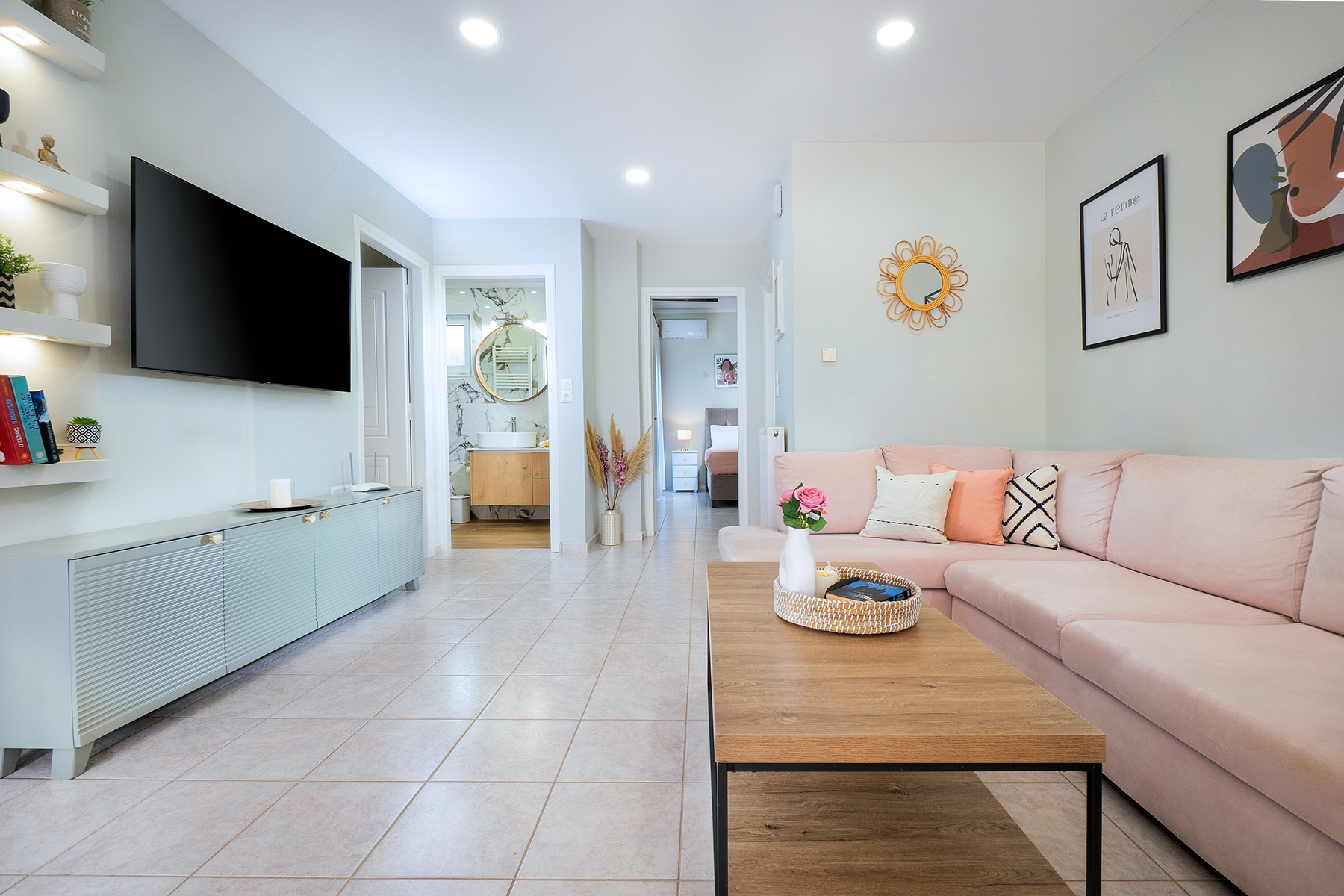 The apartment is located on the elevated ground floor level and there is also an outdoor dining table available on the small balcony of the apartment. Free wireless internet, air conditioning, washing machine and dishwasher are provided.