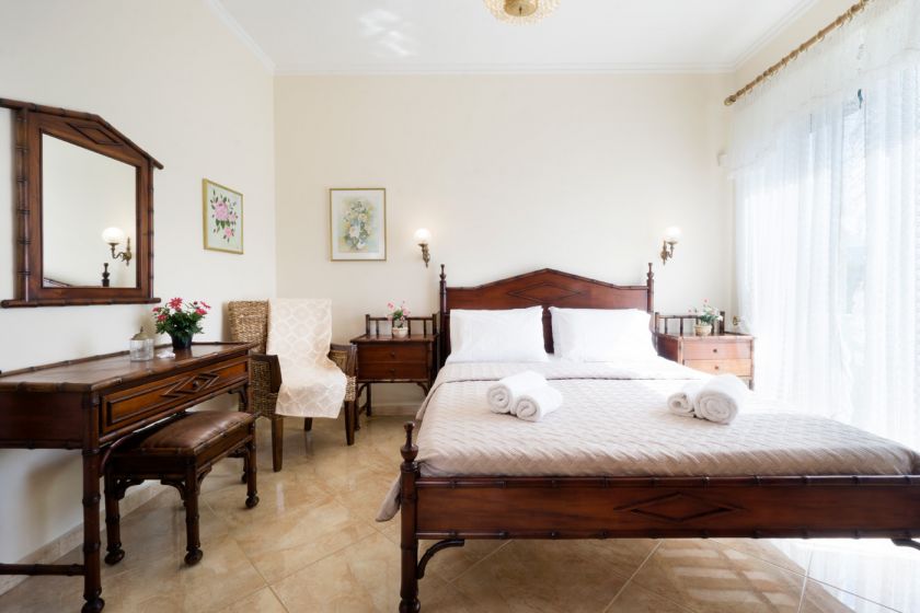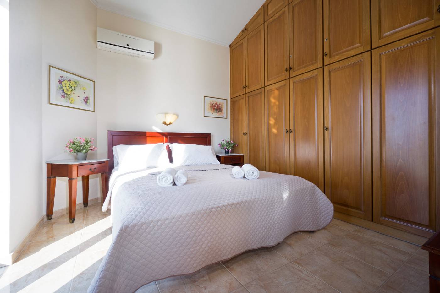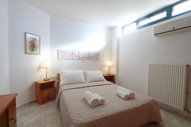 The apartment Artemis is a totally private apartment next to the pool area, with nice sea view and three bedrooms. A living room, a dining table and a fully-equipped kitchen with a refrigerator, an electric kitchen, an oven, a toaster and a coffee maker are offered in an open plan area. There are two bedrooms each furnished with a double bed, along with another bedroom equipped with a single bed. Additionally, the accommodation includes a bathroom with a shower.