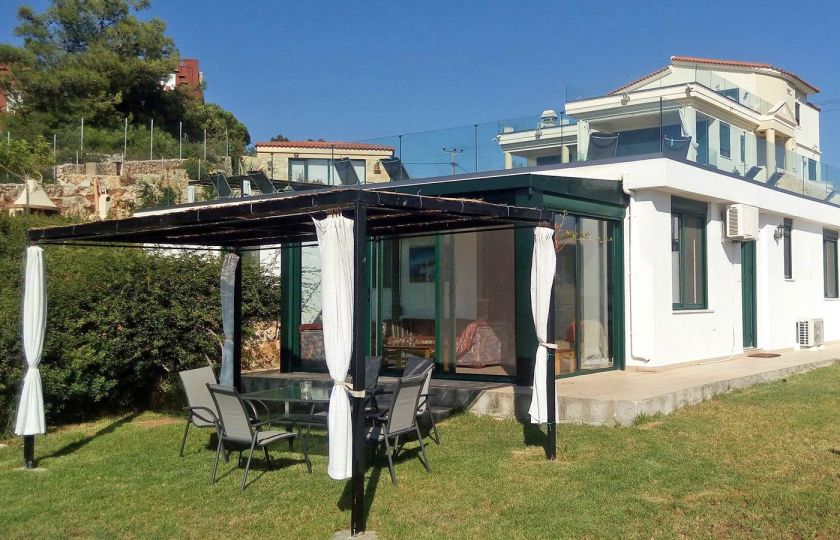 The very private, ground floor 3-bedroom Apartment Artemis has lovely sea views, located in front of and below of the swimming pool, next to a small forest with local trees. A sea view open plan area with living room corner and a dining table is provided. Two bedrooms with a double bed, one bedroom with a semi-double bed (1,20m width), as well as a bathroom with a shower are provided. One range bed for a 6th person can be placed in the living room area.