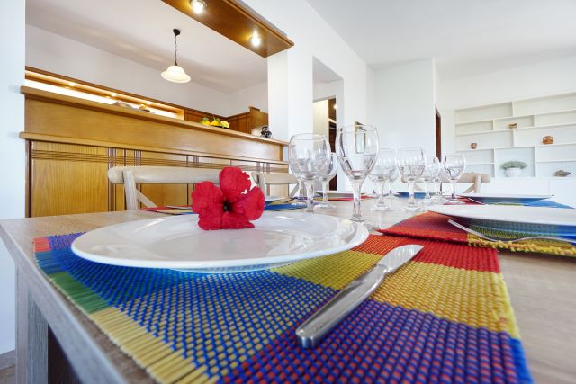 Drei Schlafzimmer, ein offener Wohnbereich, eine voll ausgestatteten Küche und ein Badezimmer mit einer Badewanne sind im Obergeschoss verfügbar. Zwei Schlafzimmer mit je einem Doppelbett, und ein Schlafzimmer mit zwei Einzelbetten sind vorhanden. Ein Balkon mit herrlichem Meerblick und einem Esstich stehen auf dieser Etage zu Verfügung.