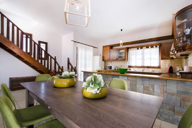 The first floor of the Villa is a big open area divided in two levels, which include an open plan living room with a big flat screen TV, a big fully equipped kitchen with a dining room and a small wc on the upper level, and another smaller living room with a fireplace on the lower level.