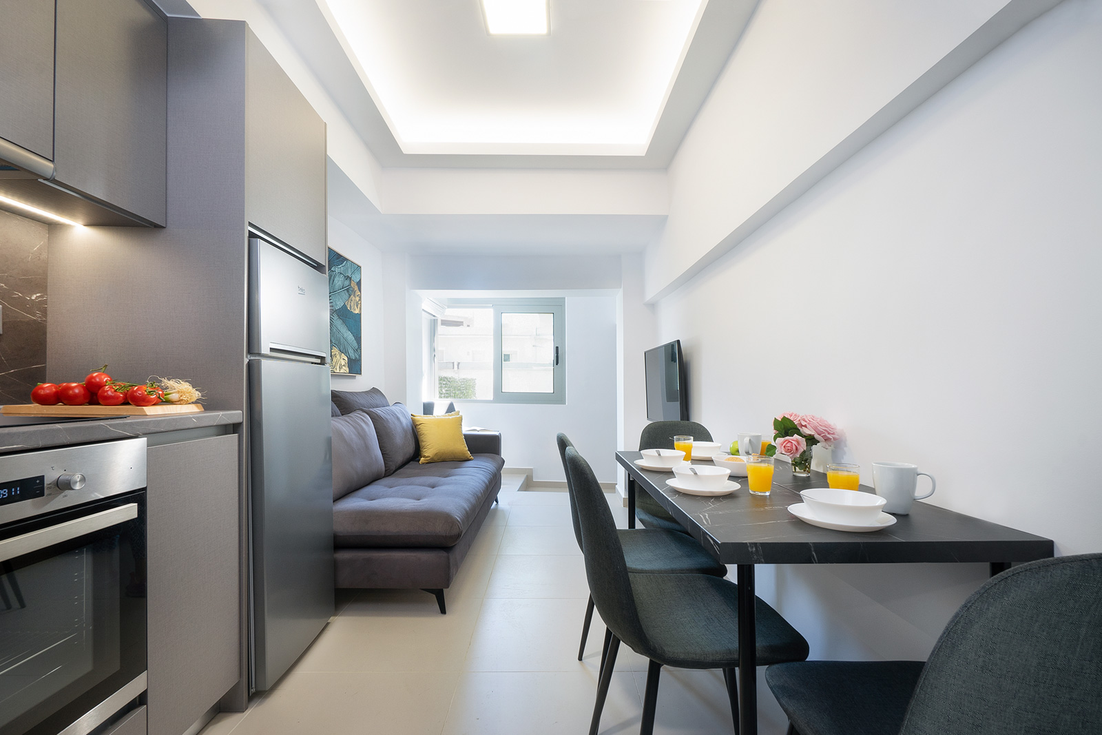 Προσφέρεται ένας άνετος χώρος ενιαίας διαρρύθμισης με ένα καναμπέ, μια τηλεόραση smart και μια πλήρως εξοπλισμένη κουζίνα. Περιλαμβάνει μεγάλο ψυγείο, κεραμική κουζίνα, ένα βραστήρα και καφετιέρα.