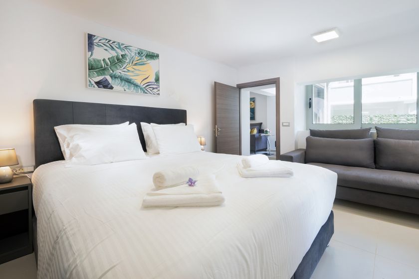 Προσφέρεται ένα υπνοδωμάτιο με δύο μονά κρεβάτια, το οποίο μπορεί να μετατραπεί σε διπλό κρεβάτι queen size, και ένα μπάνιο με πλυντήριο ρούχων. Στο υπνοδωμάτιο προσφέρεται επίσης μια τηλεόραση smart, μια ντουλάπα και χώρος γραφείου.