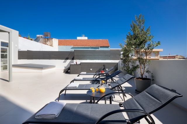Kappa Residence is a modern 3-bedroom penthouse featuring a heated Jacuzzi on its lovely, private terrace. It is located on the top floor of a small building in the newly revitalized center of the town of Chania, just 150 meters from the picturesque old town and 1200 meters from the sandy beach of Nea Chora. It is surrounded by beautiful cafes, restaurants, and boutique shops, all just a short stroll away. Kappa Residence offers three stylish bedrooms, two bathrooms, and a modern open-plan area, being a central retreat for families and friends.