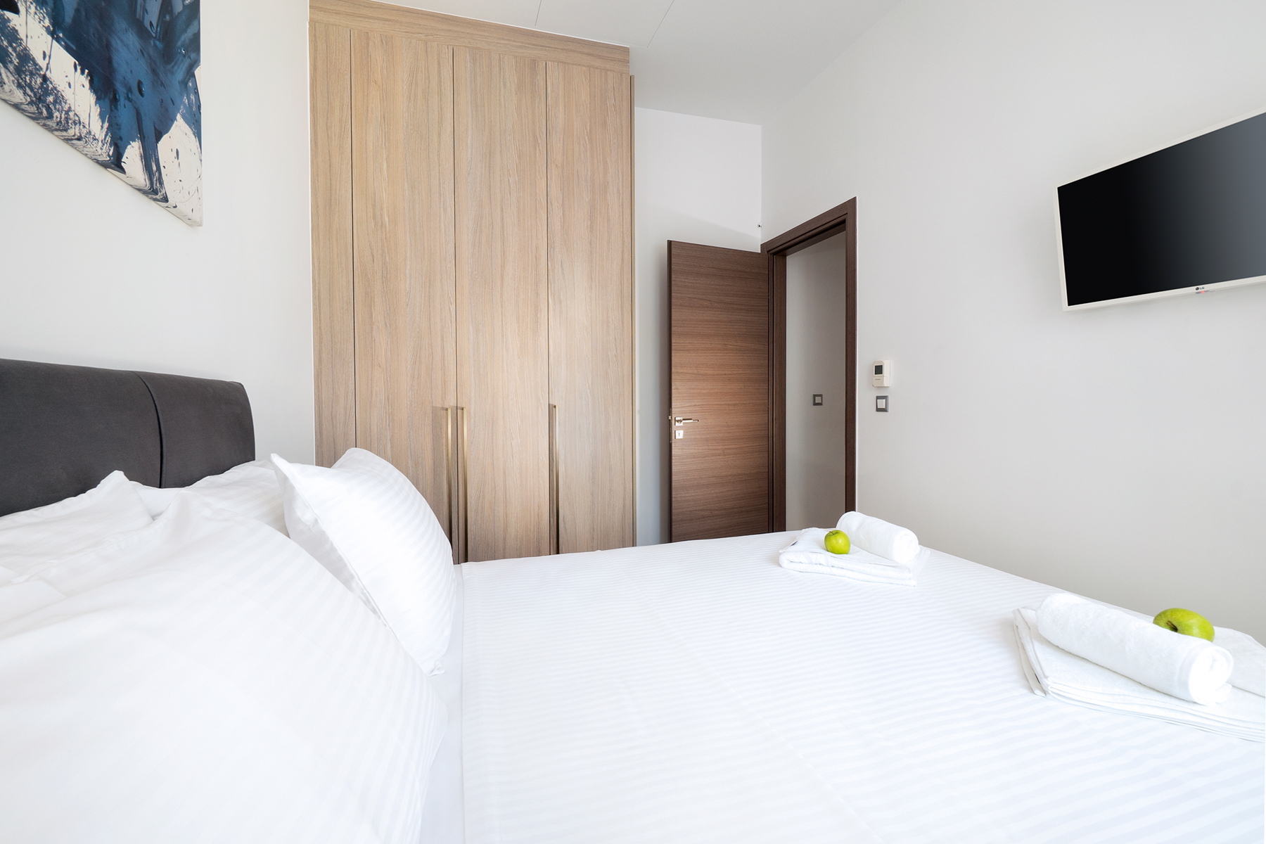 Drei Schlafzimmer jedem mit einem Queensize-Bett, einem Smart-TV und einem Kleiderschrank sind vorhanden. Zwei Duschbäder sind auch verfügbar. Es gibt ebenfalls eine Waschmaschine in einem der Badezimmer.