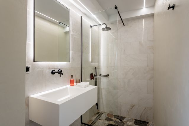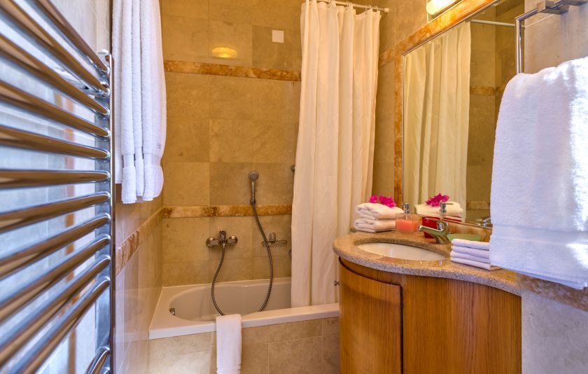 On the ground floor of every villa, a sea view double bedroom with an en-suite bathroom, as well as the open plan living room and the fully-equipped kitchen are available. A lovely fireplace, a satellite LCD 32 inch television, dvd player, air-condition, and three en-suite bathrooms are offered in every villa.