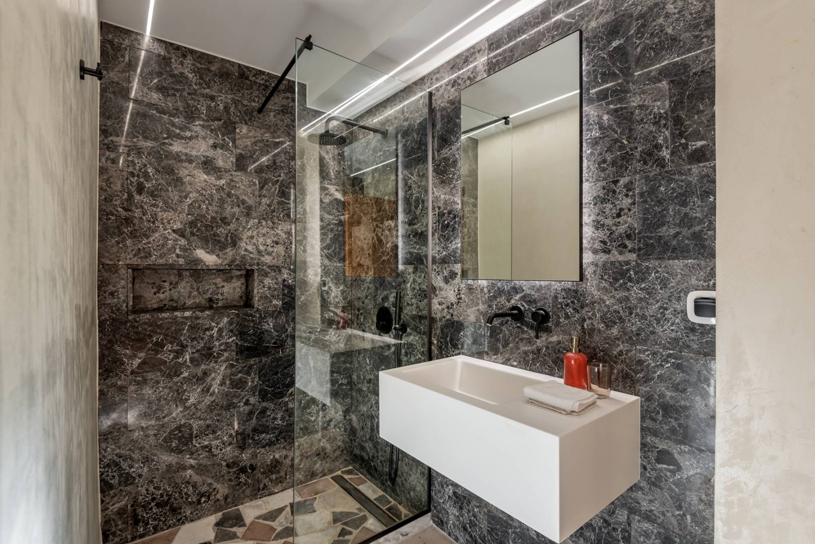 On the first floor, there is a double bedroom with an en-suite bathroom featuring a shower and a private balcony with breathtaking sea views. Additionally, a twin bedroom includes an en-suite bathroom and access to a balcony with wonderful sea views.