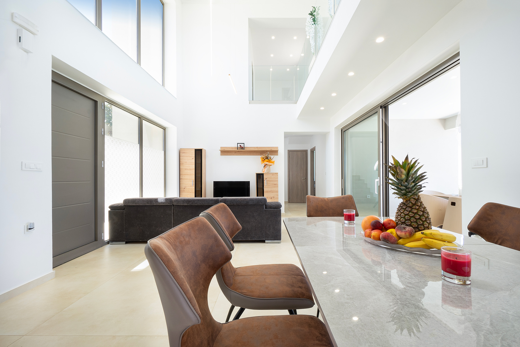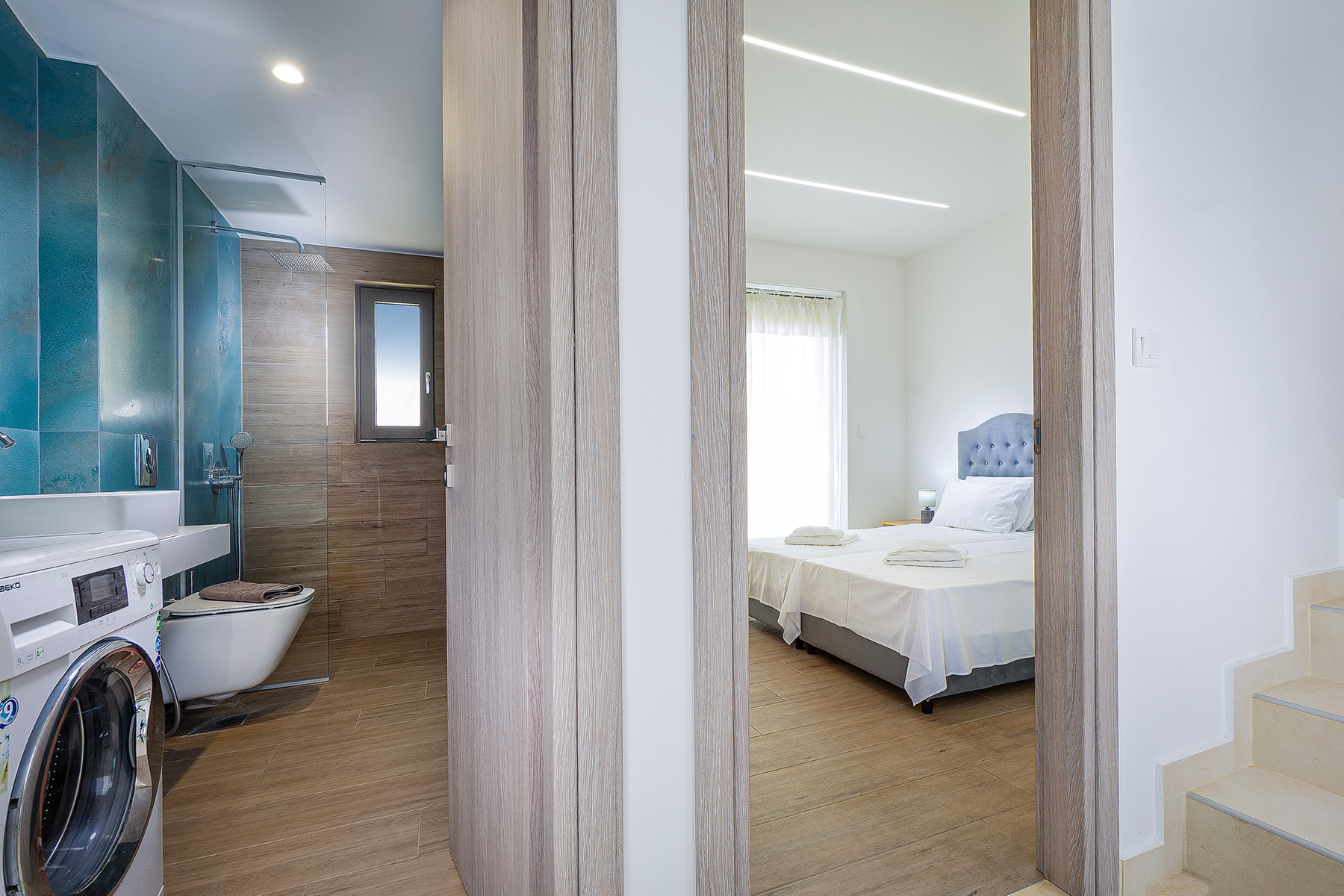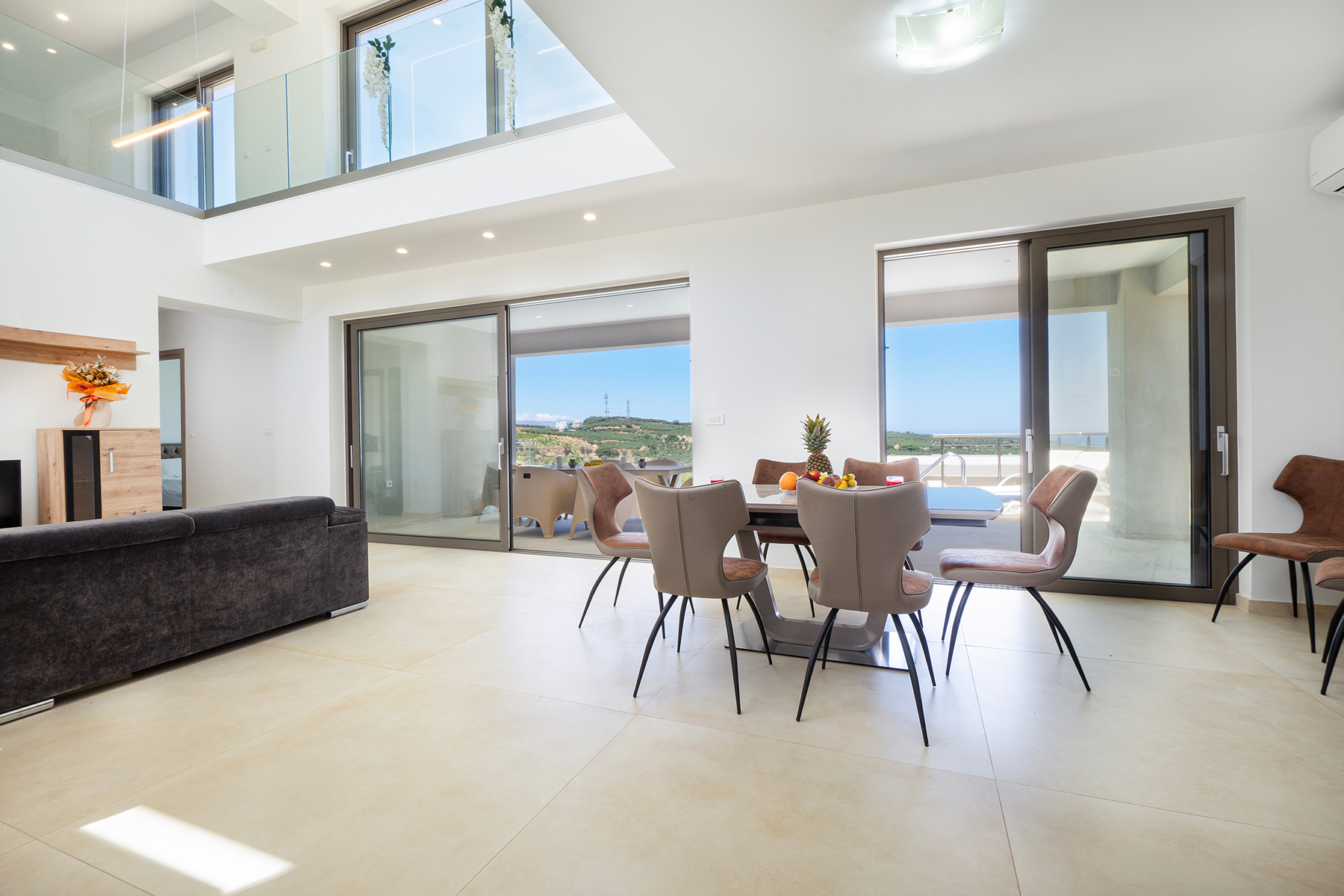 An inviting open-plan area with a cozy living corner equipped with a smart TV, a large dining area, and a fully equipped kitchen with all modern appliances is provided. On this floor, there is also one bedroom with a queen-size bed and another with two single beds, as well as a shared bathroom with a shower and a washing machine.
