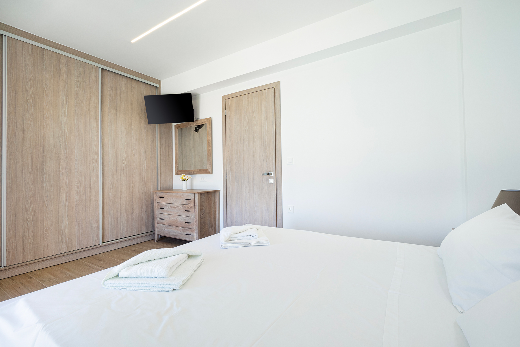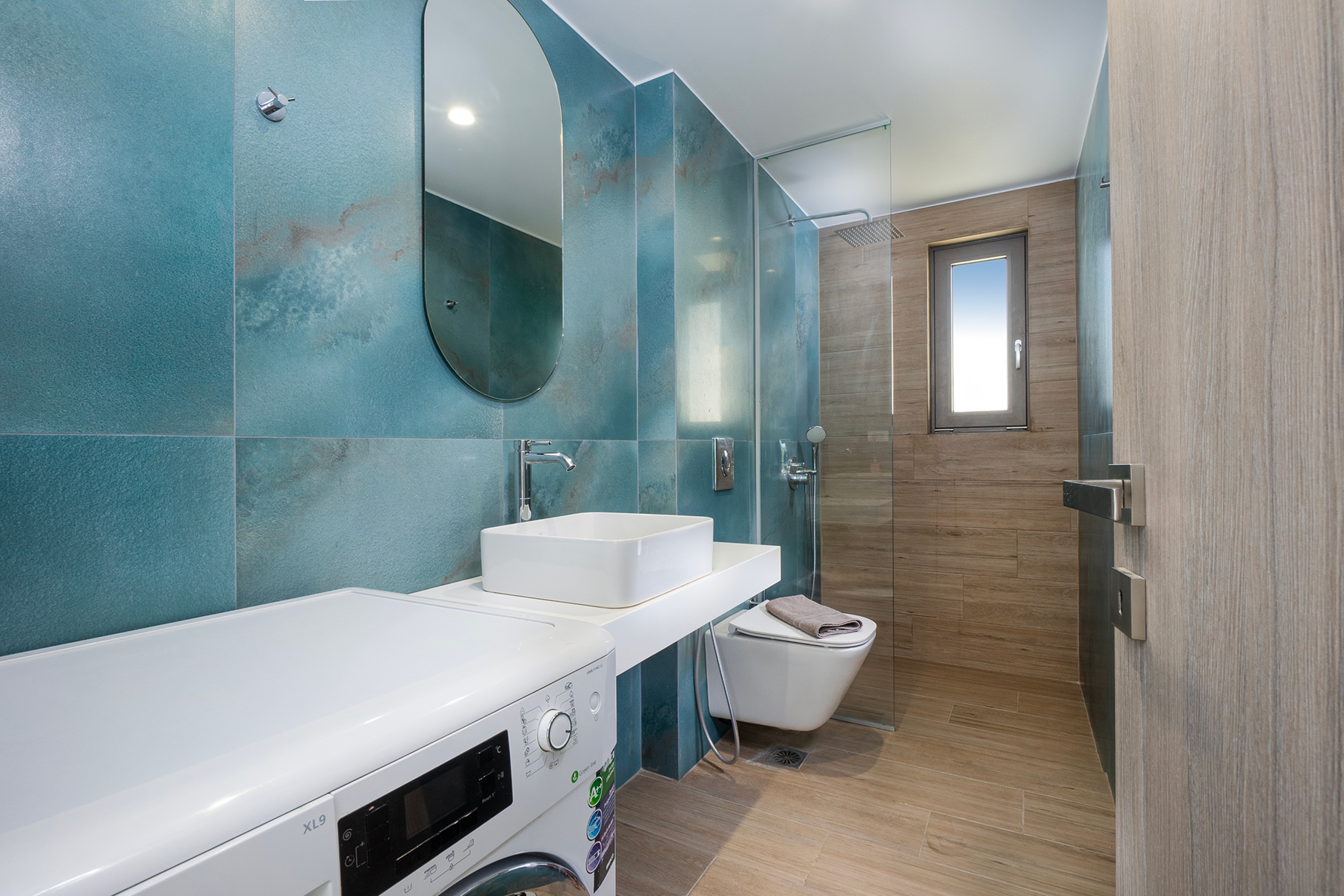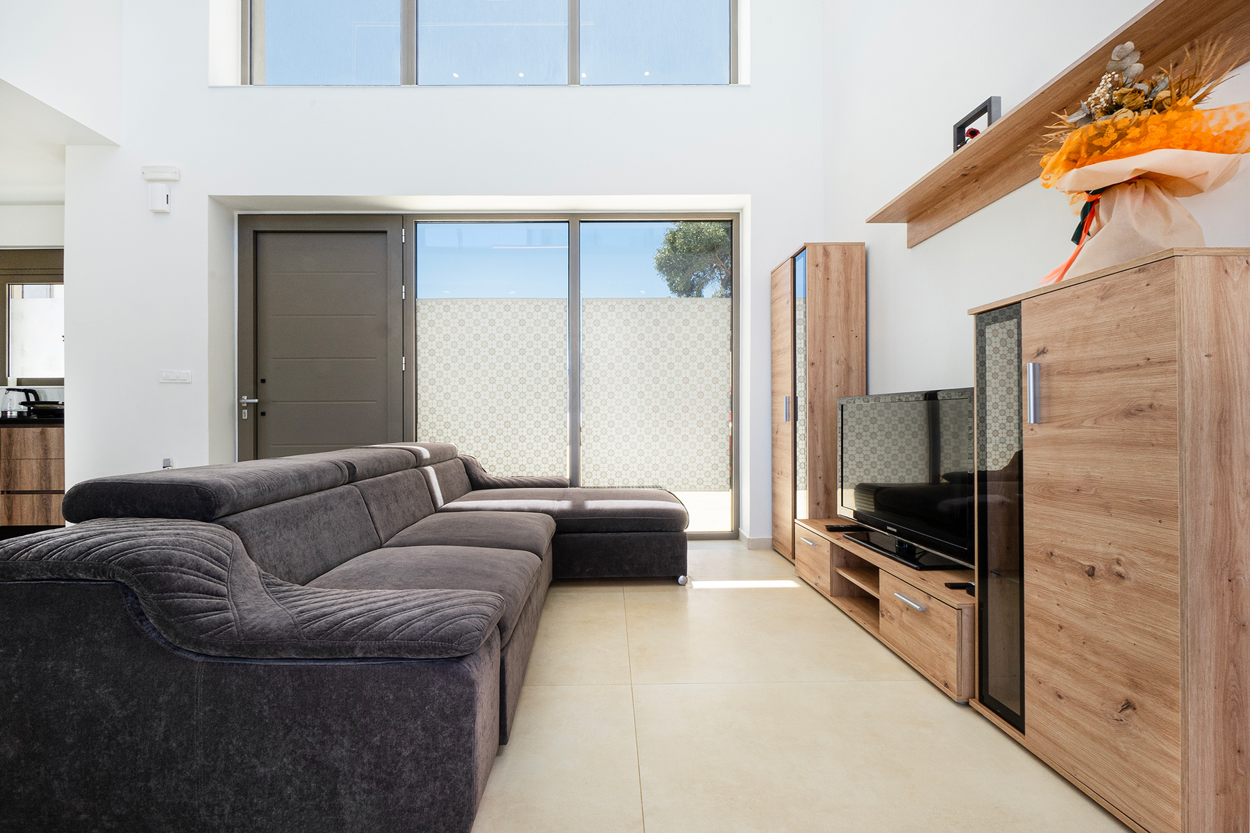 An inviting open-plan area with a cozy living corner equipped with a smart TV, a large dining area, and a fully equipped kitchen with all modern appliances is provided. On this floor, there is also one bedroom with a queen-size bed and another with two single beds, as well as a shared bathroom with a shower and a washing machine.