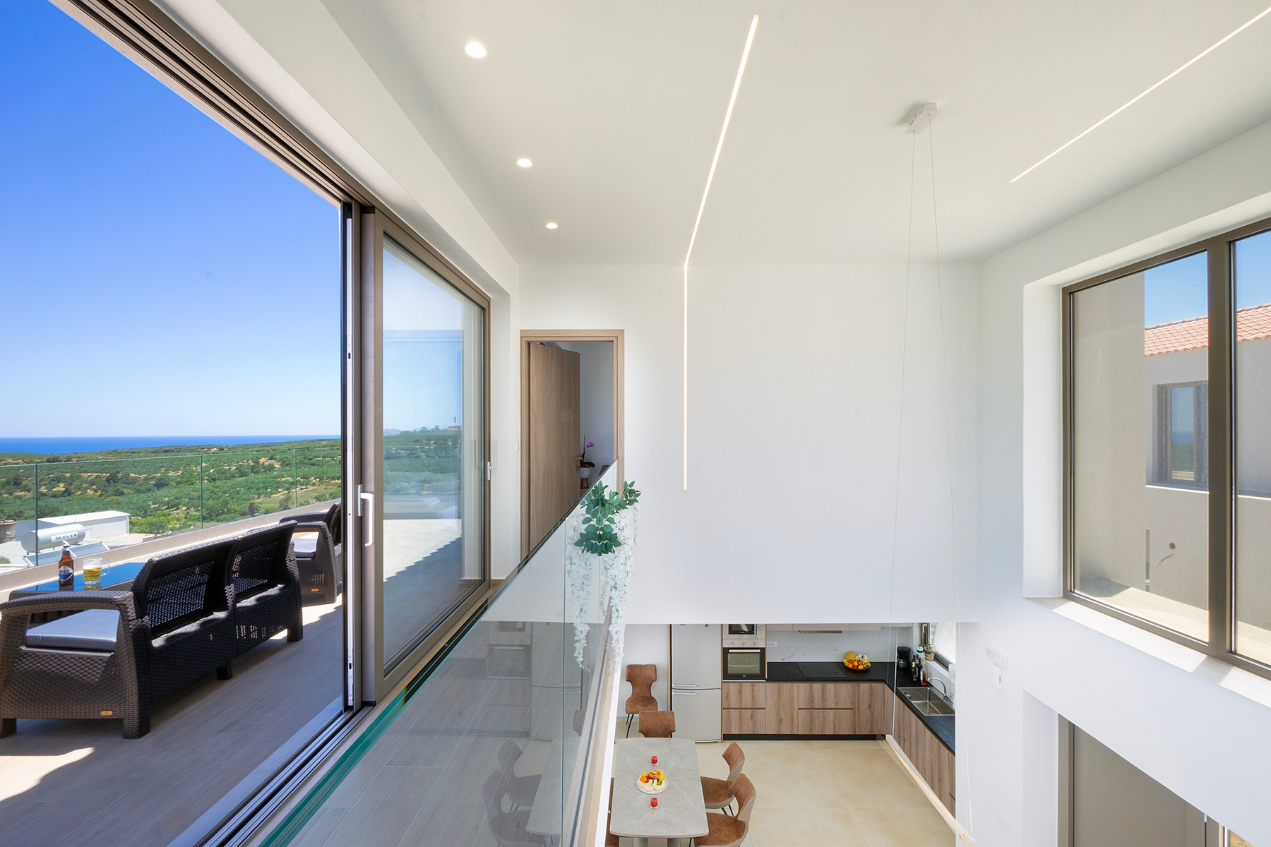 Upstairs, guests will find one double bedroom with an en-suite shower bathroom, along with a second twin bedroom, which also features its own en-suite shower bathroom, offering comfort and privacy for all guests. The upper floor opens onto a balcony with comfortable outdoor seating, offering beautiful views of the sea and surrounding nature.