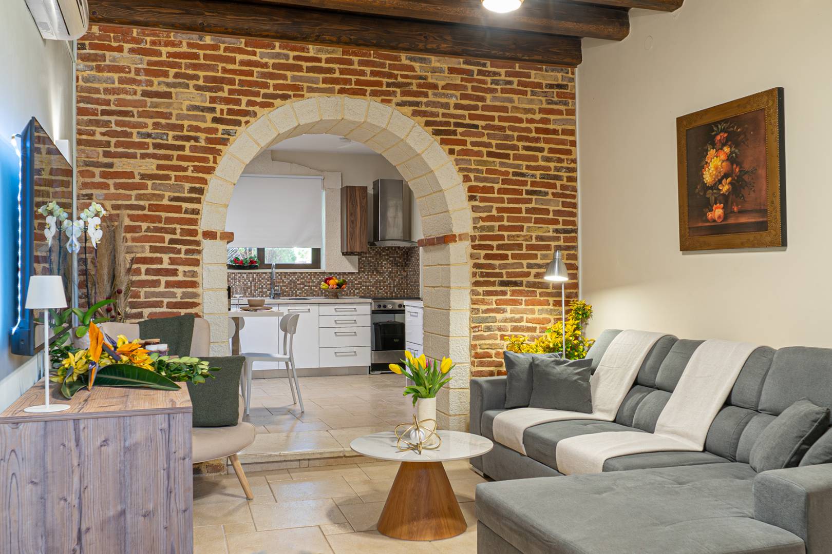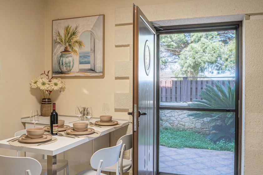 На первом этаже виллы расположена гостиная с уголком с диваном, креслом и спутниковым телевидением. Традиционная каменная арка соединяет гостиную с полностью оборудованной кухней. В числе удобств обеденный стол, электрическая кухня, большой холодильник, кофеварка, бойлер, микроволновая печь и посудомоечная машина.