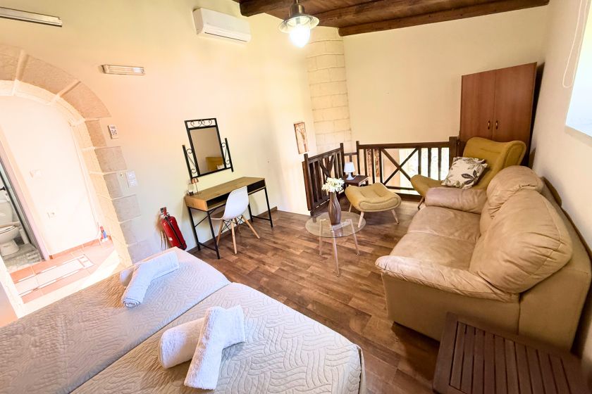 Он расположен в тихом районе Нерианы, в 700 метрах от очень красивой таверны с традиционной кухней (Сад Фросинис). В соседней деревне Вуколиес (менее 3 км) вы можете найти пекарню, два больших местных супермаркета (СИНКА, Ариадна), несколько традиционных кафе и одну таверну с критской едой (Элайас Теа). Примерно в 5 км вы можете осмотреть небольшой традиционный город Тавронитис, где есть несколько магазинов, мини-маркетов, традиционных кафе, а также пекарня, мясная лавка, аптека и кондитерская. Чуть дальше находится рыбацкая гавань Колимбари, известная отличными рыбными тавернами (Аргентина), где можно насладиться свежей рыбой.