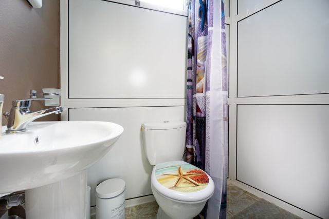 Le rez-de-chaussée de la maisonnette offre une chambre double, séparée par des rideaux pour l'intimité, de l’espace séjour muni d’un canapé-lit, une cuisine entièrement équipée avec un espace repas et une salle de bains commune avec une machine à laver.
