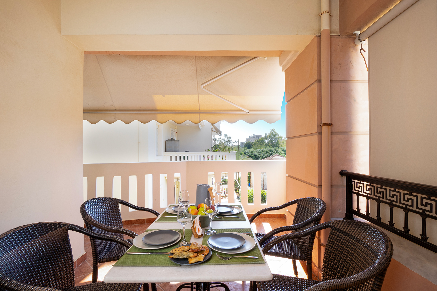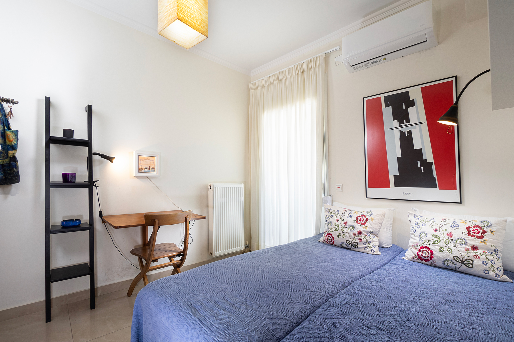 Τwo comfortable bedrooms and 1.5 bathrooms are provided. The master bedroom includes a queen-size bed and a large wardrobe, while the second bedroom features two single beds (80x200 cm), a small desk, and its own wardrobe. The second bedroom also has direct access to a lovely private balcony with beautiful open views.