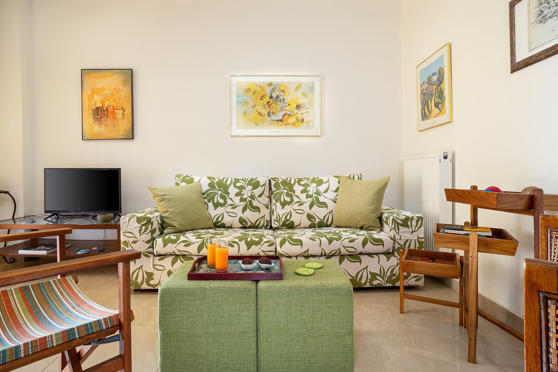 Olivia Apartment is a charming and sunny apartment featuring a spacious living room, a fully equipped kitchen, and a comfortable dining area. Guests can relax on the stylish floral sofa, or enjoy the large private balcony for breakfast or a meal.