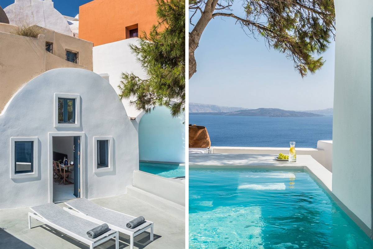 The private terrace of Pina Caldera Residence features an outdoor jacuzzi - pool with incredible sea views of the Caldera, an outdoor seating area and sun loungers next to a beautiful pine tree. The ideal location of the Villa is perfect to enjoy a peaceful time with the famous sunset view of Santorini and panoramic sea views.