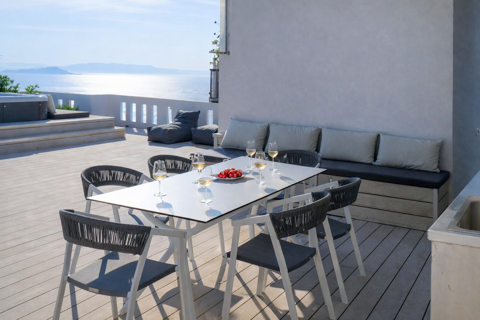 A private rooftop terrace of about 100 sq m features a heated Jacuzzi with views over the town of Chania and the sea. It is equipped with two sun loungers, a cozy seating area, and an outdoor dining space. Guests can indulge in the breathtaking scenery while enjoying the secluded luxury of this beautifully decorated retreat.