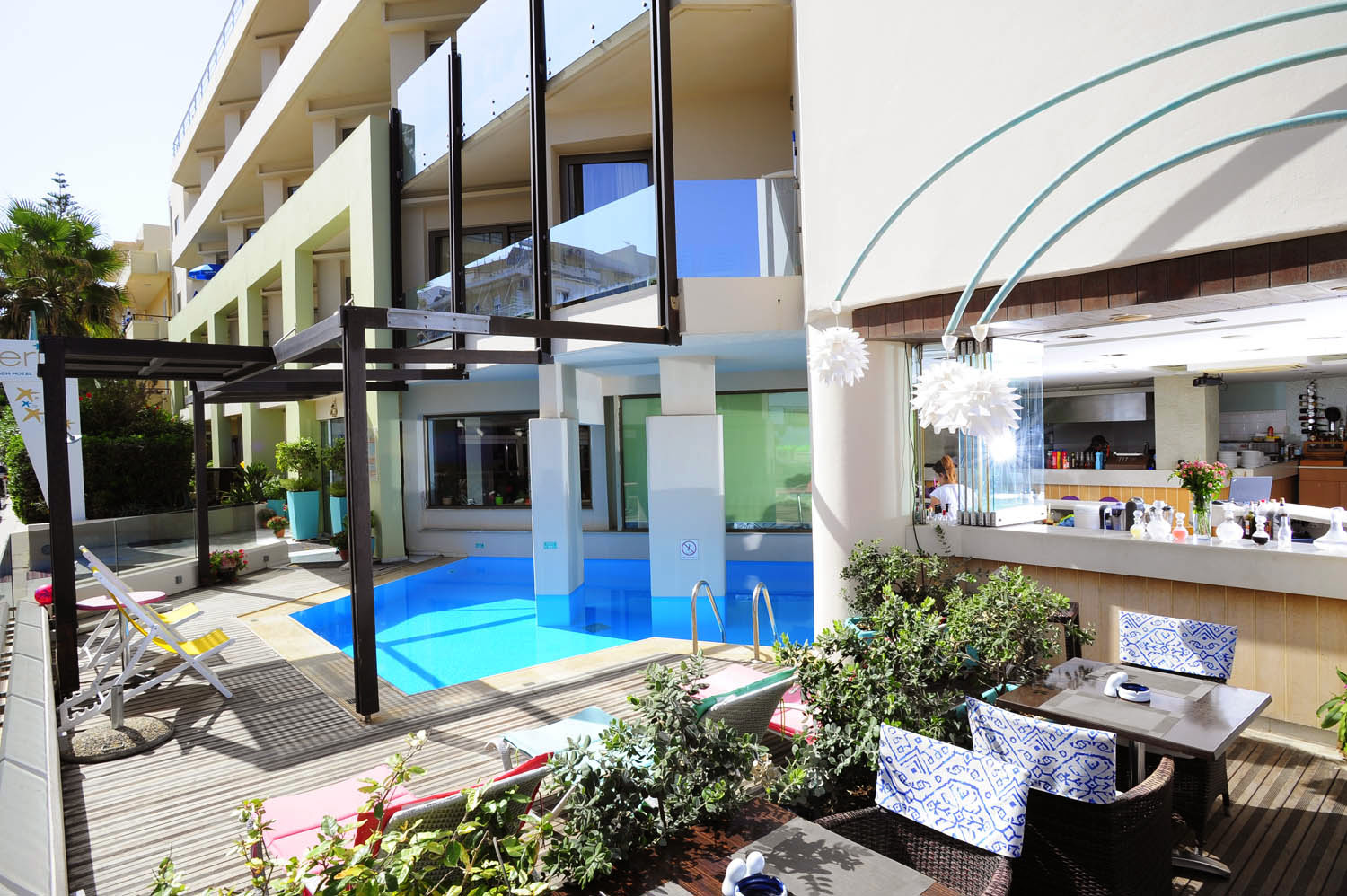 Each Studio or Apartment is elegantly decorated and well equipped with orthopedic mattresses, air conditioning and a modern kitchenette. Steris Beach Hotel Apartments is also Green Key awarded for its energy and water saving systems. Free wi-fi is also provided.