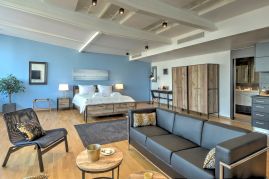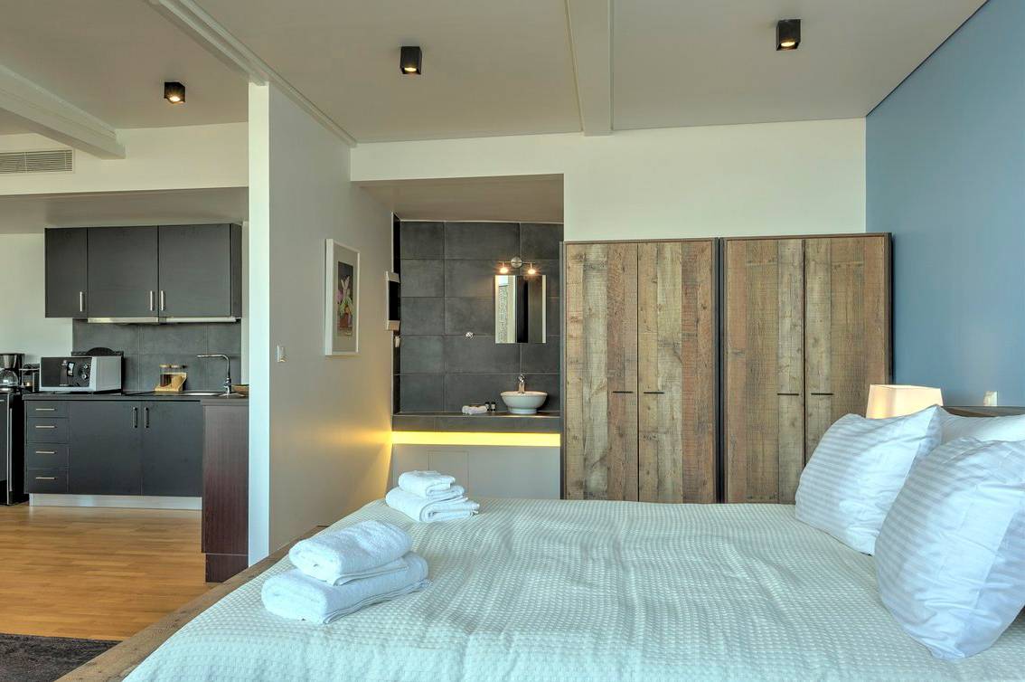 Each Suite offers a modern open plan area with a double bed and a seating area with a TV, a bar-style dining area with stools, an office area and a kitchenette. A wall of windows offer an impressive view of Athens city and Acropolis, which is also very beautiful at night with the city lights. A shower bathroom, free wireless internet and air conditioning are provided in each Suite and an elevator is available in the building.
