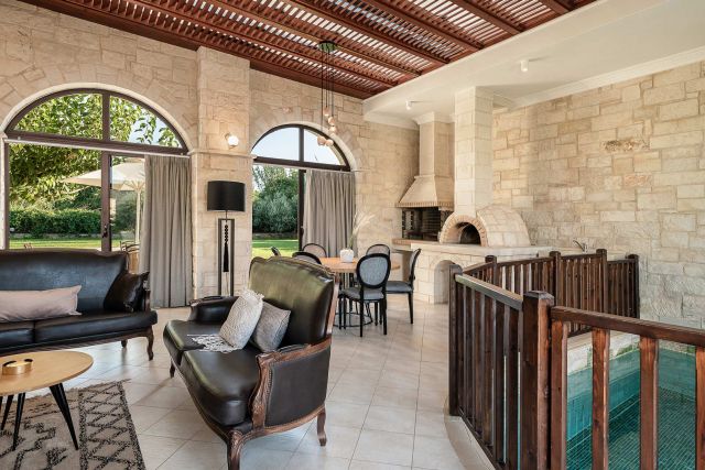 The Villa has an open plan living room area with a fully equipped kitchen, a dining area and a barbecue corner. One double bedroom with an ensuite bathroom on the ground floor, and another double bedroom with a double bed and an ensuite bathroom on the upper floor are provided. A half indoor and half outdoor private pool is offered.