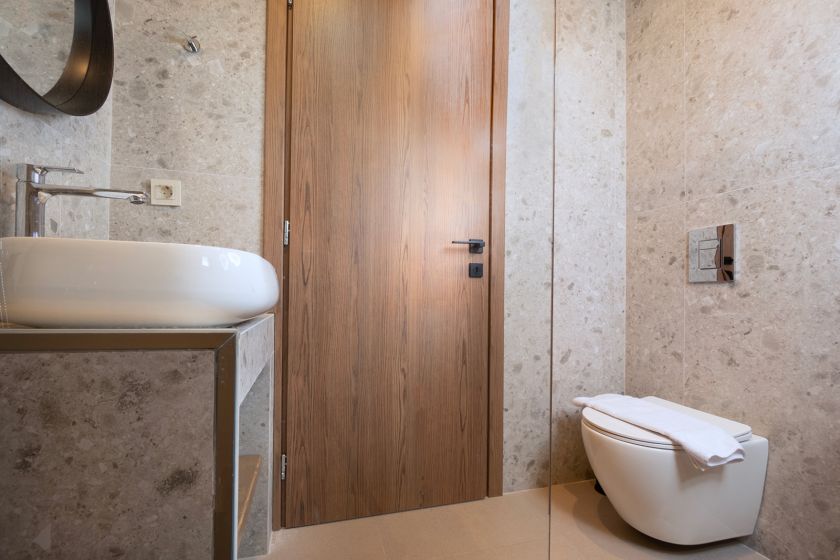 Villa George offers three bedrooms: two with king-size beds and one with two single beds, perfect for families or small groups. A seventh guest can be accommodated on a fold-out bed. Each bedroom features a smart TV and a wardrobe for added convenience.