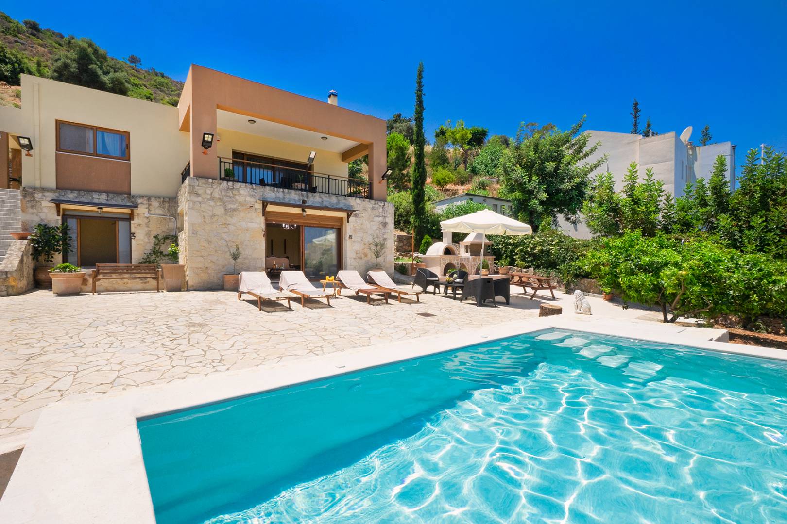 Villa Leon features a sea view private pool of 25 sqm with beautiful sea view. All guests can spend sunny days on the sun loungers, relax among Cretan nature, and dine together in the outdoor dining area. A stone BBQ and a traditional wood-fired oven set the scene for relaxed evenings.