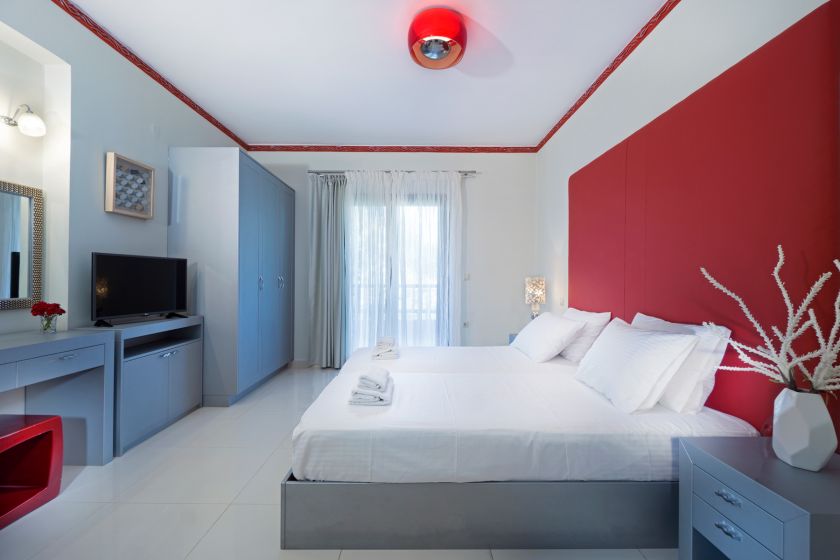 Στο ισόγειο είπεδο της πισίνας προσφέρεται ένας ενιαίος χώρος με καθιστικό, τραπεζάκι φαγητού και μια πλήρως εξοπλισμένη κουζίνα. Επίσης, δύο υπνοδωμάτια με δύο κρεβάτια το καθένα (τα δύο κρεβάτια στο ένα υπνοδωμάτιο μπορούν να μετατραπούν σε ένα διπλό κρεβάτι) με δύο μπάνια.