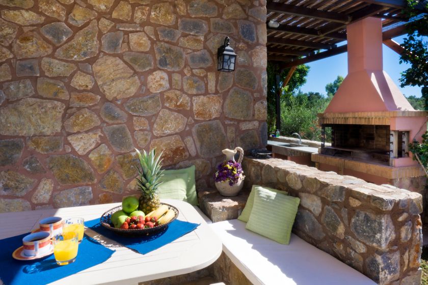 Η υπέροχη βίλα είναι χτισμένη σε στυλ μεζονέτας, που περιβάλλεται από ένα μεγάλο υπαίθριο χώρο (1.500 τετραγωνικών μέτρων) με κήπους, δέντρα και όμορφη ιδιωτική πισίνα 70 τετραγωνικών. Η βίλα έχει κτιστεί με παραδοσιακά υλικά, χρησιμοποιώντας ξύλο και πέτρα ως κυρίαρχα υλικά, συνδυάζοντας με απόλυτη αρμονία όλες τις σύγχρονες ανέσεις με την παράδοση.