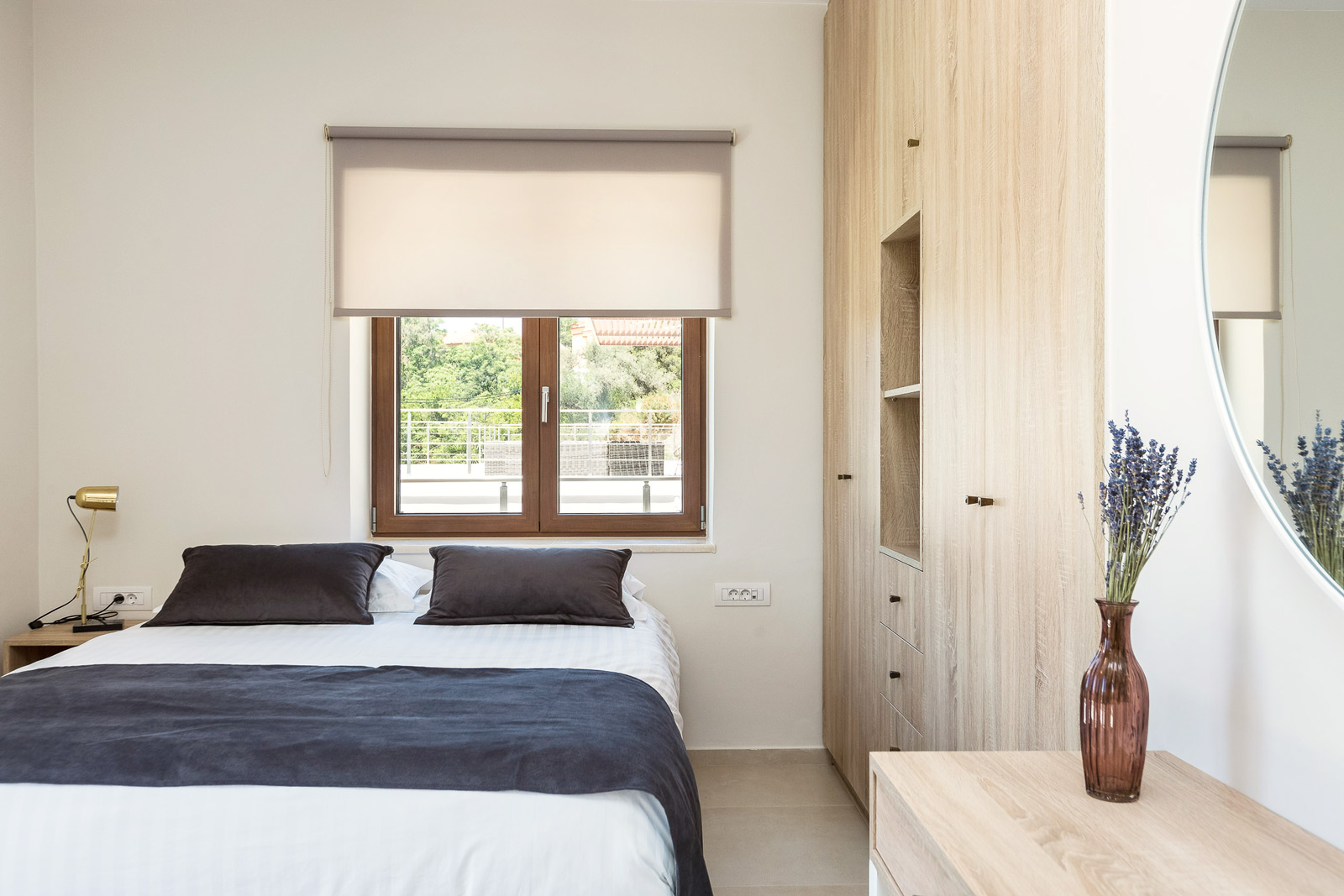 The modern Villa Skyline is designed in a maisonette style. The ground floor level consists of an open plan living room area with a fireplace, a dining area and a fully equipped kitchen as well as a bedroom with a double bed and a common shower bathroom. The open plan living room has direct access to the pool through balcony doors.