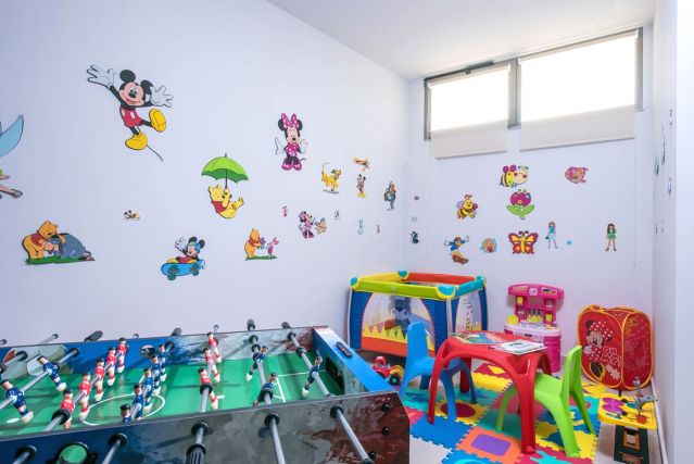The master bedroom with a double bed, an en-suite shower bathroom and access to two sea-view balconies is provided on the top floor of the villa. Two more comfortable bedrooms with a semi-double bed and a common bathroom with hydro massage shower are found on the same level. Another bedroom with a double bed and a bathroom with a bathtub are offered on the lower floor of the villa as well as a small private gym and a playroom area.